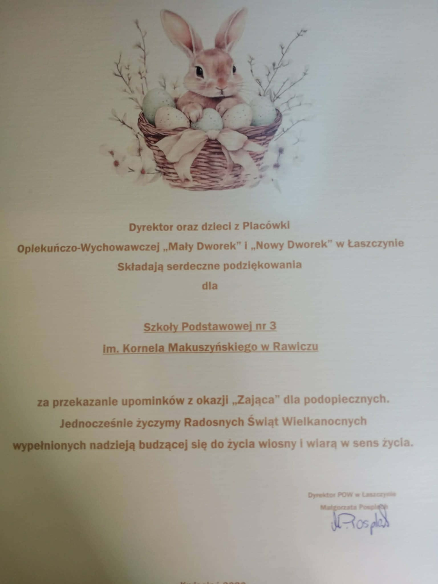 Akcja charytatywna „Zajączek” po raz kolejny pokazała, jak wielką siłę ma wspólne działanie i otwarte serca. Dzięki zaangażowaniu wielu osób udało się przygotować wyjątkowe wsparcie dla najbardziej potrzebujących uczniów oraz wychowanków „Małego Dworku” w Łaszczynie.
