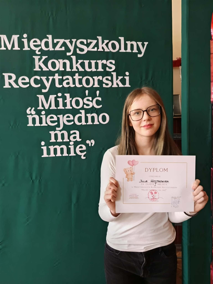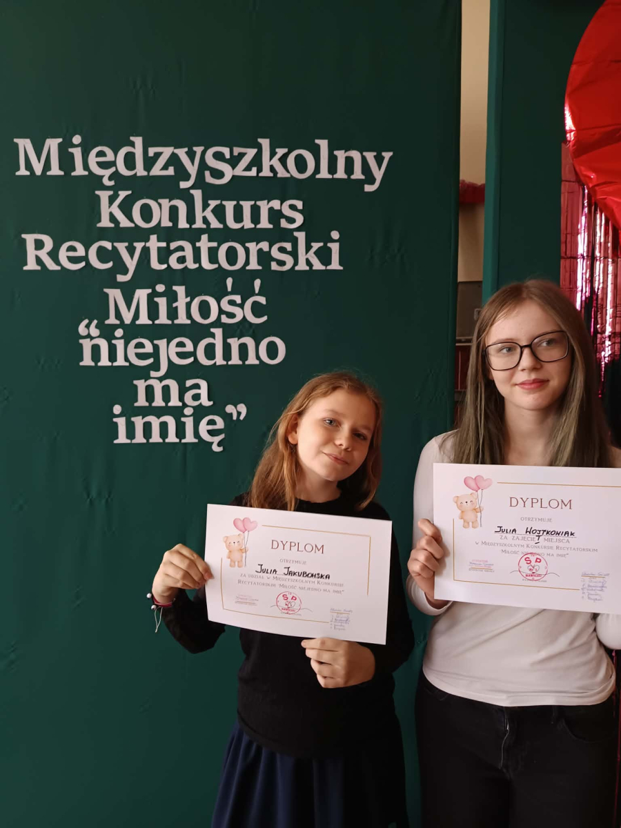 11 lutego br. w Zespole Szkolno-Przedszkolnym nr 1 w Rawiczu odbył się Gminny Konkurs Recytatorski pod hasłem: "Miłość niejedno ma imię". W wydarzeniu wzięli udział uczniowie kl. IV-VIII, prezentując utwory znanych poetów polskich i zagranicznych. Naszą szkołę reprezentowały dwie uczennice klasy VI a - Julia Jakubowska i Julia Wojtkowiak.