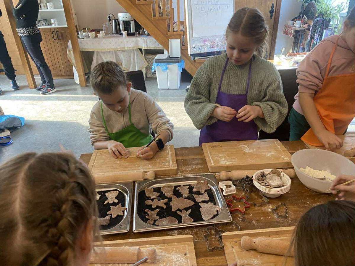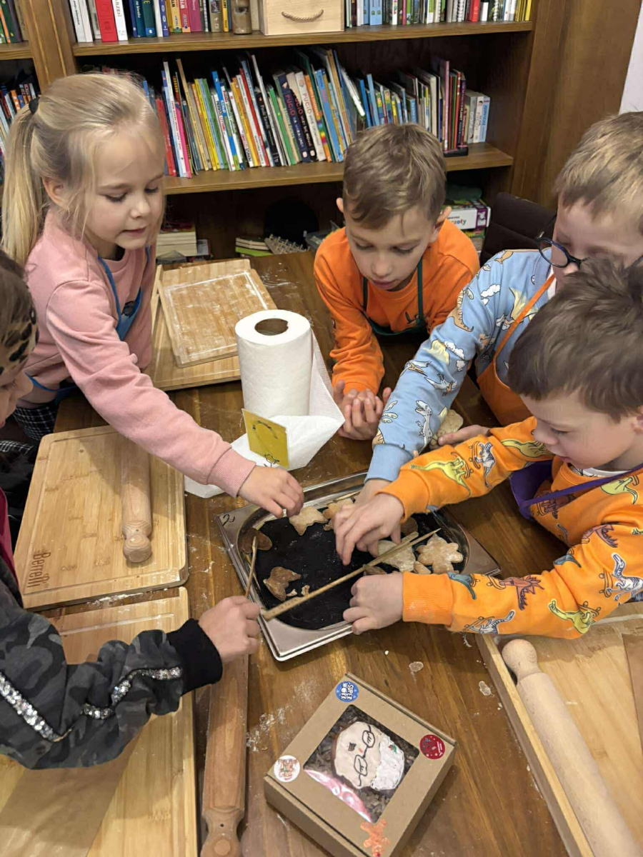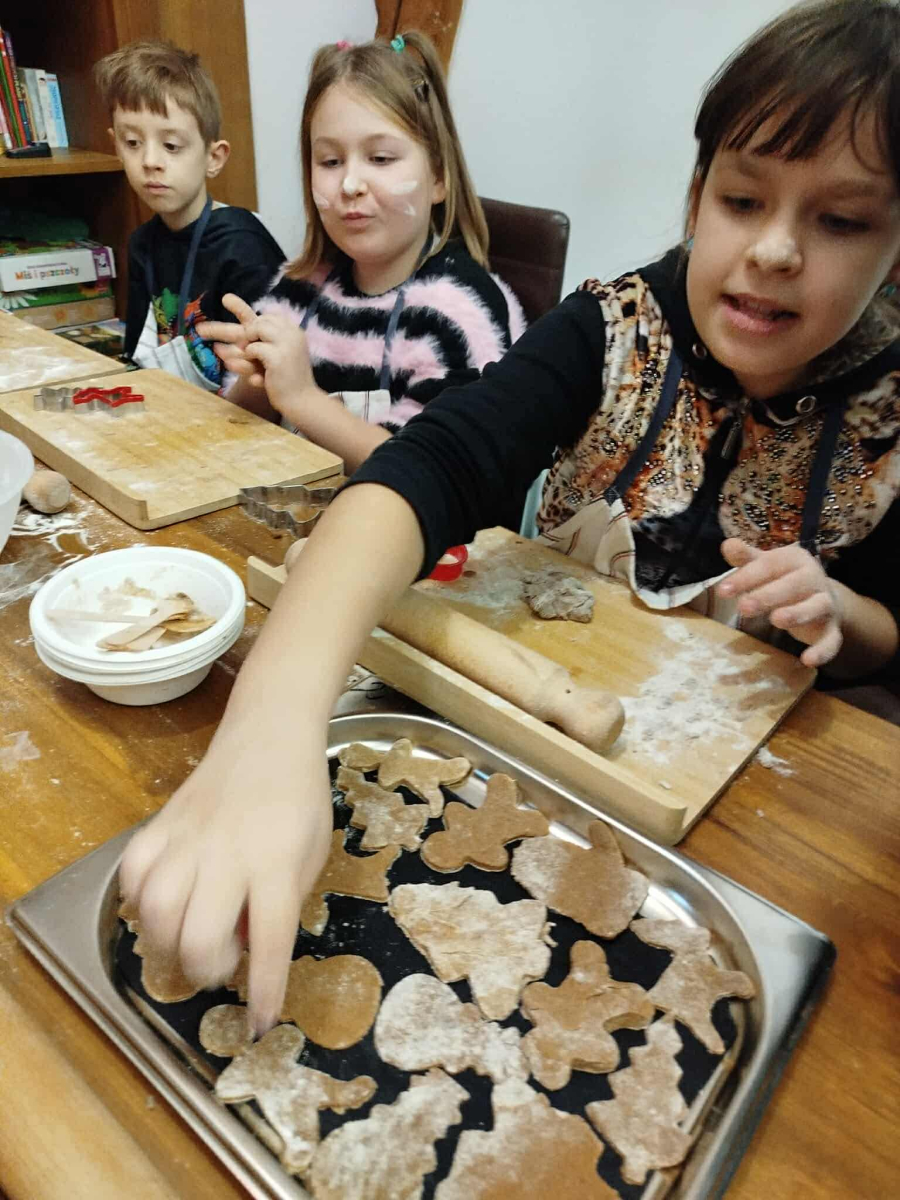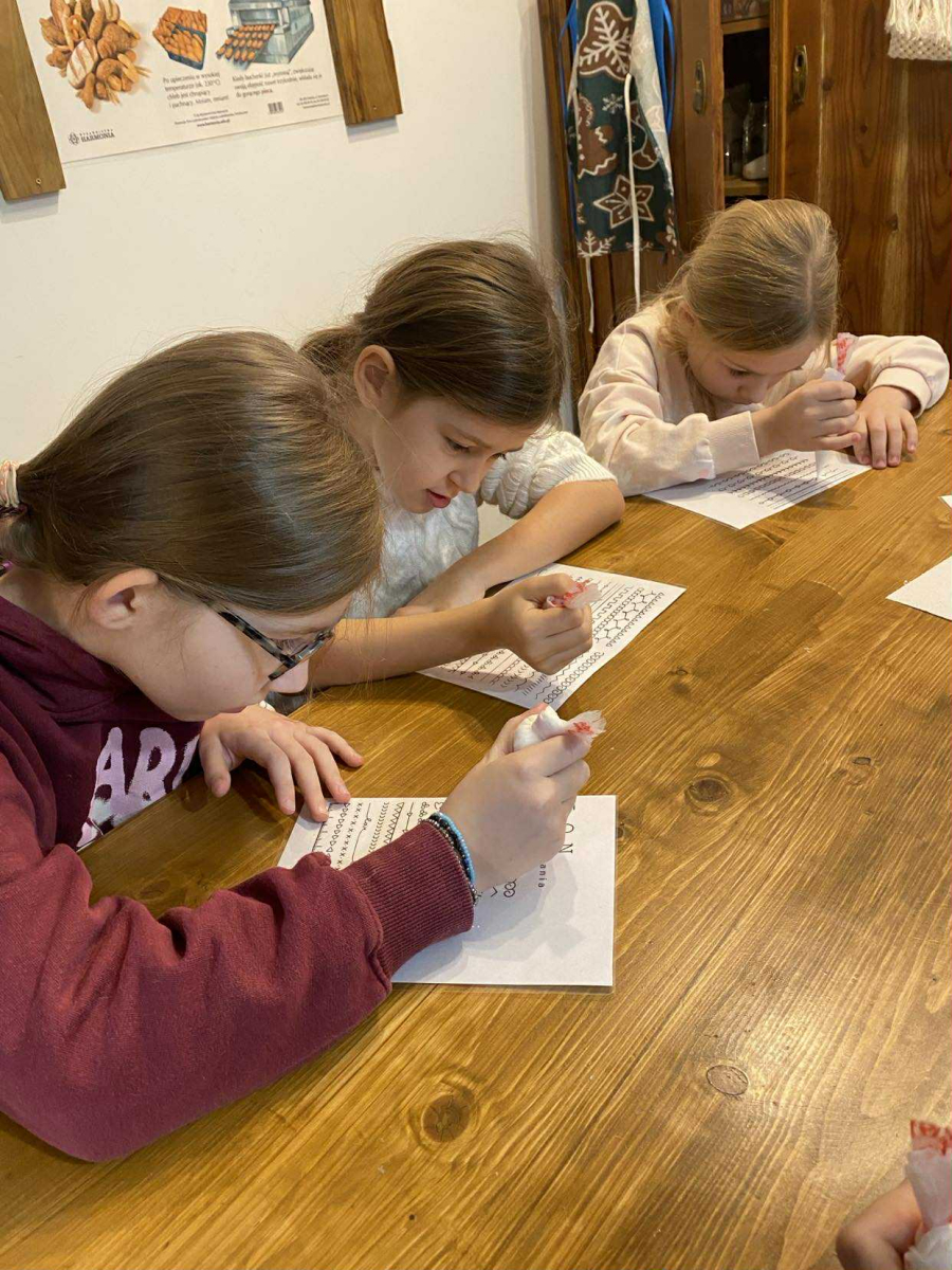 * samodzielne wyrabianie ciasta, wałkowanie i wykrawanie piernikowych kształtów,